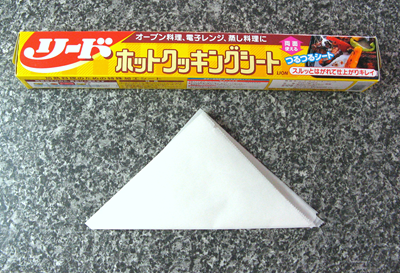 ここからは落し蓋の作り方、クッキングシート(圧力釜の直径より大きい物)をほぼ正方形にカットしたら次のように折り曲げる。