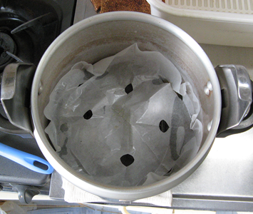 8分が経ったので蓋を開けて見たところ。どうやら落し蓋の作り方がよかったようで、壊れていません。